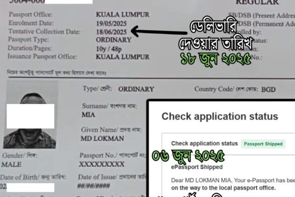 উদাহরন সহ বুঝিয়ে বলি- এই প্রবাসী ভাই তার ই-পাসপোর্টের আবেদন করেছিল মালশিয়ার ই- পাসপোর্ট সেবাকেন্দ্র Expat Services Kuala Lumpur থেকে ১৯ মে ২০২৫ তারিখে, ডেলিভারি এর তারিখ ১৮ জুন ২০২৫ আজ ৮ জুন ২০২৫ তারিখ, তার E-Passport অনলাইন স্ট্যাটাস দেখা যাচ্ছে Passport Shipped – যার অর্থ হচ্ছে তার পাসপোর্ট রেডি হয়ে ঢাকা থেকে মালয়েশিয়ার Bangladesh…